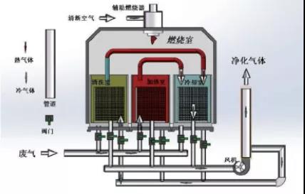 RTO把有機(jī)廢氣加熱到760攝氏度以上,使廢氣中的VOCs在氧化分解成二氧化碳和水。氧化產(chǎn)生的高溫氣體流經(jīng)特制的陶瓷蓄熱體,使陶瓷體升溫而蓄熱”,蓄熱用于預(yù)熱后續(xù)進(jìn)入的有機(jī)廢氣,從而節(jié)省廢氣升溫的燃料消耗。陶瓷蓄熱體應(yīng)分成三個(gè)(含三個(gè))以上的區(qū)或室,每個(gè)蓄熱室依次經(jīng)歷蓄熱-放熱-清掃等程序,周而復(fù)始,連續(xù)工作。蓄熱室放熱后應(yīng)立即引入部分已處理合格的潔凈排氣對該蓄熱室進(jìn)行清掃(以保證VOC去除率在99%以上),只有待清掃完成后才能進(jìn)入蓄熱程序。RTO蓄熱式廢氣處理設(shè)備,運(yùn)行費(fèi)用省,有機(jī)廢氣的處理效率高的優(yōu)點(diǎn),適應(yīng)廢氣濃度1000~10000mg/m3,分解效率:99%—99.5%。是目前較為經(jīng)濟(jì)可靠的達(dá)到50mg/m3嚴(yán)格的排放標(biāo)準(zhǔn)的VOCs治理技術(shù),得到了廣泛的應(yīng)用。