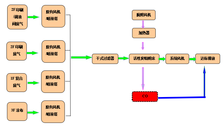 印刷排氣系統(tǒng)合并后處理,保持原有的噴淋塔,有機(jī)廢氣先通過干式過濾器進(jìn)行預(yù)處理,預(yù)處理后進(jìn)入活性炭吸附劑床進(jìn)行吸附,處理后的氣體可直接達(dá)標(biāo)排放。當(dāng)活性炭飽和后,利用加熱的空氣作為介質(zhì),將吸附在活性炭里的有機(jī)廢氣吹脫出來(lái),經(jīng)循環(huán)后增濃,即濃縮成高濃度的廢氣后進(jìn)入催化燃燒裝置,在催化劑的作用下,于200-300℃時(shí)分解成無(wú)害化的CO2和H2O后達(dá)標(biāo)排放。