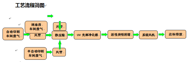 因為該企業(yè)印刷機車間均為密閉車間,且已做排風(fēng)系統(tǒng),但排風(fēng)系統(tǒng)和小風(fēng)機均為直排到高空和廠房1樓外部,影響到了周圍環(huán)境。經(jīng)過我司工程師現(xiàn)場勘查,結(jié)合企業(yè)的實際生產(chǎn)情況,我們最終決定采用UV光解法+活性炭吸附法來進行處理。